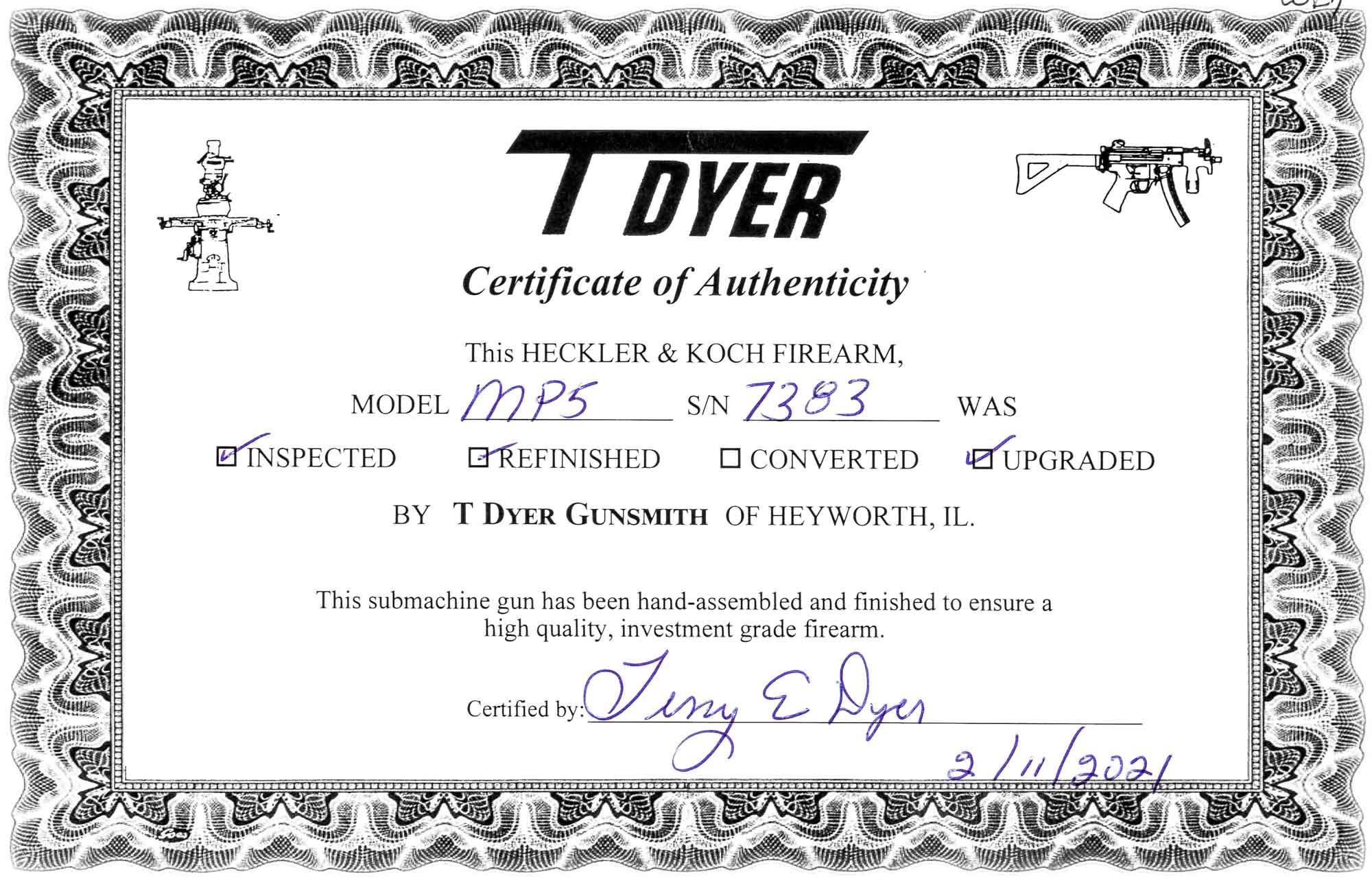 Ruben Mendiola Posted February 26, 2021 Report Share Posted February 26, 2021 7383 HK MP5A3, HK Weapons Specialties Machine Gun Registered Receiver with SEF Trigger Housing Upgraded by Mr. Terry Dyer Registered Receiver HK MP5A3 in Excellent Condition upgraded by Mr. Terry Dyer, SEF Trigger Pack, 3-Lug Adapter Installed, Stamped MP5, Original Magazine and Magazine Paddle Release. Like everything we sell, In Stock and Ready to eForm to your Dealer and available for your inspection in our office in Miami, FL. SOLD This gun has been recently serviced by Terry Dyer using our standard work order of “Make it Right”. What this means to you, is that once you receive your gun, you will be able to go out and enjoy it to its fullest (or stick it in the safe, knowing it is ready to go), because no expense has been spared in making sure it runs to its full potential. The checklist that each gun received includes the following • Complete visual inspection • Initial test firing for function and safety • Re-engraving of model when applicable • As necessary, strip the gun to bare metal, parkerize the base metal to act as a primer to promote better paint adhesion, and finally apply a special 3 part paint to bring the gun back to better than factory appearance • Verify headspace, timing, check bolt, extractor, etc. • Modify for a magazine paddle release when needed • Install the proper trigger housing • Final test firing and cleaning There is a long waiting list for any good HK smith to properly inspect and upgrade a HK product – we have taken that worry and wait out of the equation so we can offer the finest HKs on the market. As with all DealerNFA, Inc. guns, this item is owned by us, and is in stock at our Miami office, where it is available for inspection or eForm transfer to a dealer in your state. HK – In a world of compromise, DealerNFA doesn't. As with all DealerNFA, Inc. guns, this item is owned by us, and in stock at our Miami office, where it is available for inspection or eForm transfer to a dealer in your state. Dealernfa, Inc Ruben Mendiola President For the quickest response, please contact us through our toll free number 7 days a week, from 8:00 AM to 9:00 PM EST, or by email: ruben@dealernfa.com 305-271-3436 866-NFA-WANT (866-632-9268) Toll Free 866-415-7066 Toll Free Fax Please visit our website for more detailed images that can be magnified at: | www.dealernfa.com | Facebook | Instagram | We are dealers and not Brokers. All firearms are in stock under our control and owned by DealerNFA, Inc With over 30 years in the Class III business, dealing in high quality legal firearms is not a hobby, but a profession - you will receive well deserved fast professional service. We are always looking for and paying top dollar for high quality legally registered machine gun, please either call me our my Toll Free line, email or fax. DealerNFA, Inc. pays the ATF transfer tax and payment is sent overnight. Florida residents are subject to Florida Sales tax. Link to comment Share on other sites More sharing options...