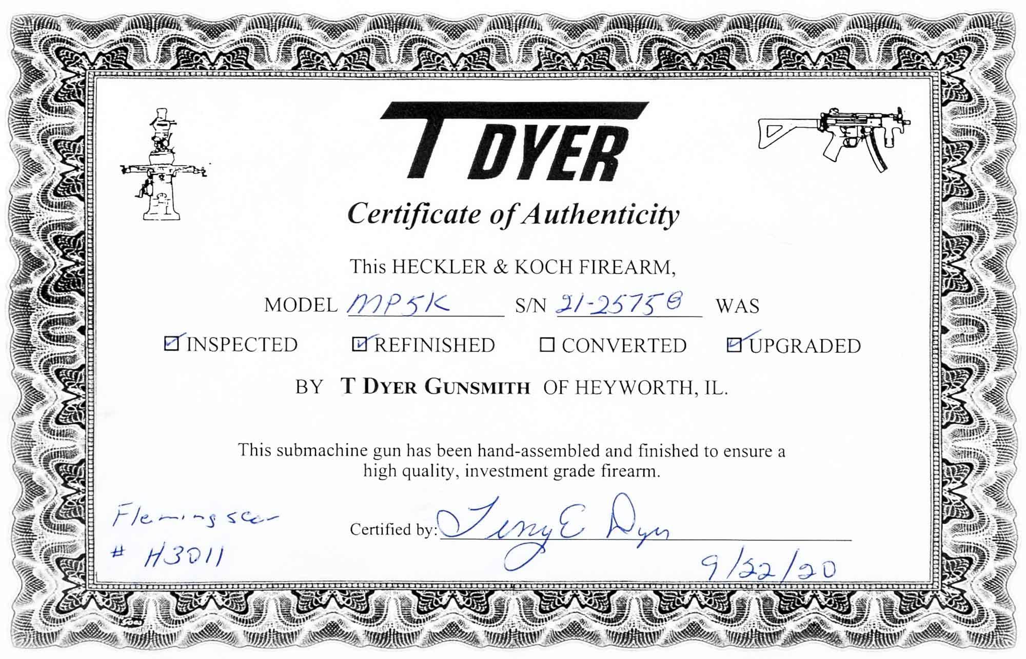 Ruben Mendiola Posted March 31, 2023 Report Share Posted March 31, 2023 H3011 & 2125758 HK MP5K-SBR, HK, Fleming Machine Gun Auto Sear Installed in a Four Position Trigger Pack in an MP5K-SBR Upgraded by Mr. Terry Dyer with a Threaded Barrel. Host Gun was initially registered as an SBR by Mr. Mike Woodward owner of TSC LLC in Ruther Glen, VA Gun is in Excellent Condition Four Position Trigger Pack, Threaded Barrel with 3-Lug Adapter, Stamped MP5, Threaded Barrel, Original Magazine and Magazine Paddle Release and includes an original magazine Like everything we sell, In Stock and Ready to eForm to your Dealer and available for your inspection in our office in Miami, FL. $58,995 - SOLD This gun has been recently serviced by Terry Dyer using our standard work order of “Make it Right”. What this means to you, is that once you receive your gun, you will be able to go out and enjoy it to its fullest (or stick it in the safe, knowing it is ready to go), because no expense has been spared in making sure it runs to its full potential. The checklist that each gun received includes the following • Complete visual inspection • Initial test firing for function and safety • Re-engraving of model when applicable • As necessary, strip the gun to bare metal, parkerize the base metal to act as a primer to promote better paint adhesion, and finally apply a special 3 part paint to bring the gun back to better than factory appearance • Verify headspace, timing, check bolt, extractor, etc. • Modify for a magazine paddle release when needed • Install the proper trigger housing • Add a 3-lug adapter or replace the barrel as needed • Final test firing and cleaning There is a long waiting list for any good HK smith to properly inspect and upgrade a HK product – we have taken that worry and wait out of the equation so we can offer the finest HKs on the market. As with all DealerNFA, Inc. guns, this item is owned by us, and is in stock at our Miami office, where it is available for inspection or eForm transfer to a dealer in your state. HK – In a world of compromise, DealerNFA doesn't. As with all DealerNFA, Inc. guns, this item is owned by us, and in stock at our Miami office, where it is available for inspection or eForm transfer to a dealer in your state. Dealernfa, Inc Ruben Mendiola President For the quickest response, please contact us through our toll free number 7 days a week, from 8:00 AM to 9:00 PM EST, or by email: ruben@dealernfa.com 305-271-3436 866-NFA-WANT (866-632-9268) Toll Free 866-415-7066 Toll Free Fax Please visit our website for more detailed images that can be magnified at: | www.dealernfa.com | We are dealers and not Brokers. All firearms are in stock under our control and owned by DealerNFA, Inc With over 30 years in the Class III business, dealing in high quality legal firearms is not a hobby, but a profession - you will receive well deserved fast professional service. We are always looking for and paying top dollar for high quality legally registered machine gun, please either call me our my Toll Free line, email or fax. DealerNFA, Inc. pays the ATF transfer tax and payment is sent overnight. Florida residents are subject to Florida Sales tax. Quote Link to comment Share on other sites More sharing options...