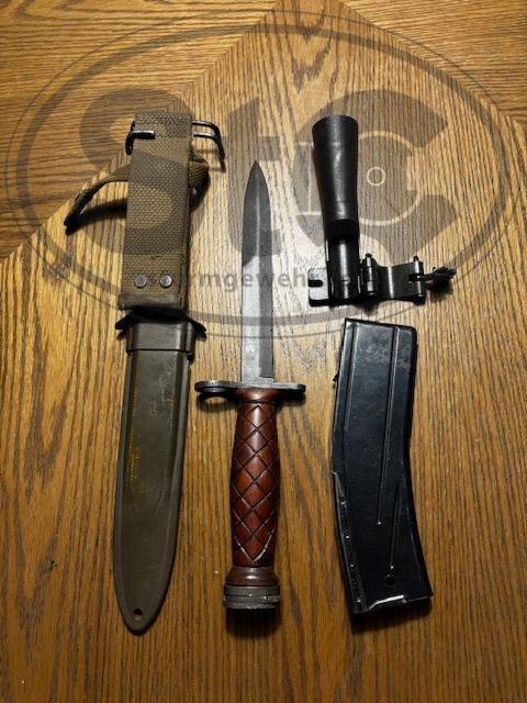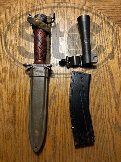 tranham Posted July 11, 2024 Report Share Posted July 11, 2024 (edited) Excellent M2 made by Inland. Form 4 lists maker as Inland as well. I picked this up recently from a local estate. Was owned by chief of police in Springfield TN at one point Comes with sling, oiler, mag, flash suppressor and NOS m4 bayonet with scabbard made by Camillus. It’s a rare prototype wooden handled model. Carbine has early flat bolt, nicely marked stock (Red River Arsenal Depot), Inland General Motors 2-44 barrel, bore is mirror shiny. Runs great! I can do 1/2 down and 1/2 on transfer. Available for test fire near Nashville TN. SPF Email for more pics. Tranham@hotmail.com references on request. Edited September 1, 2024 by tranham Pics not working Link to comment Share on other sites More sharing options...
