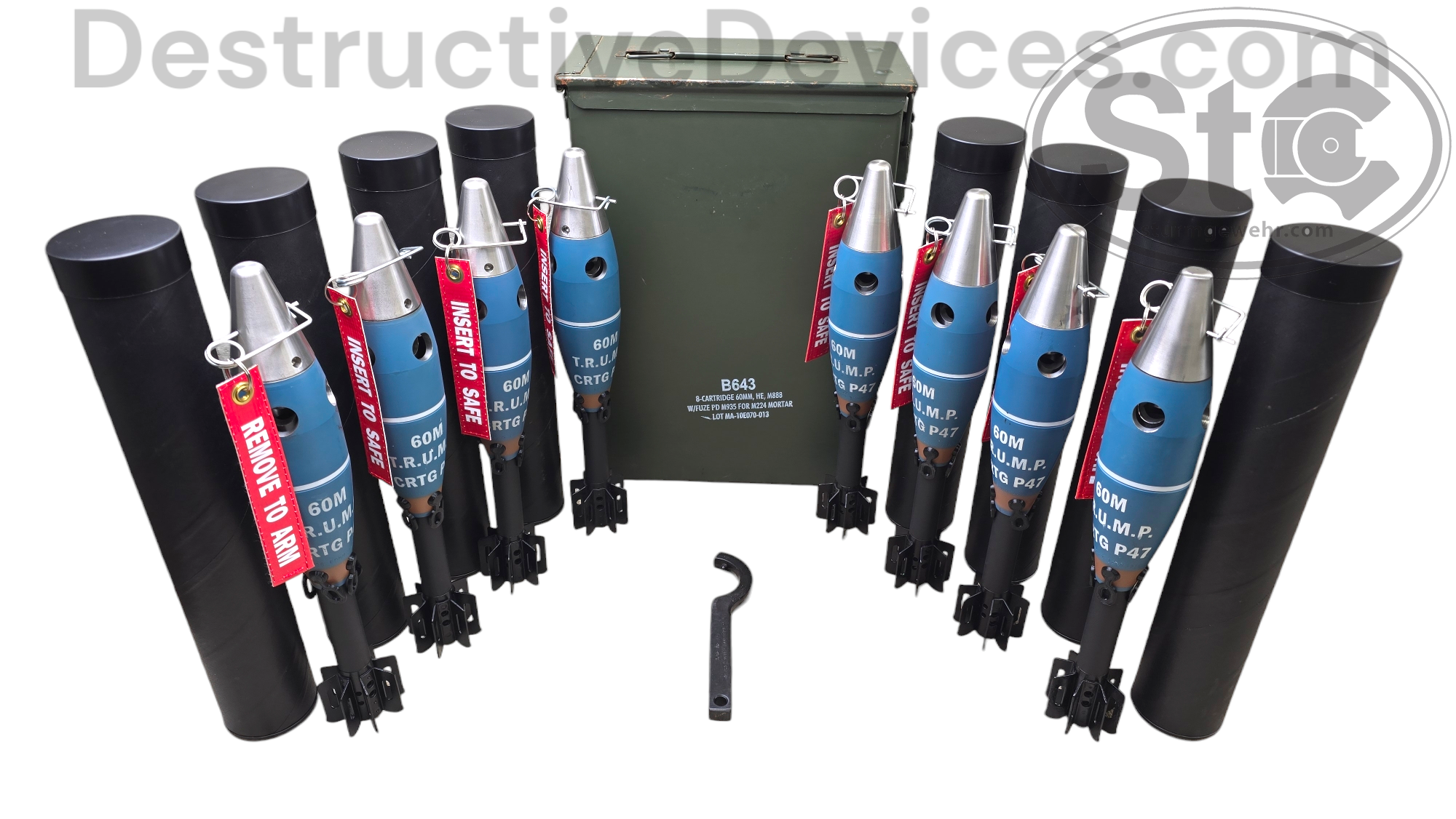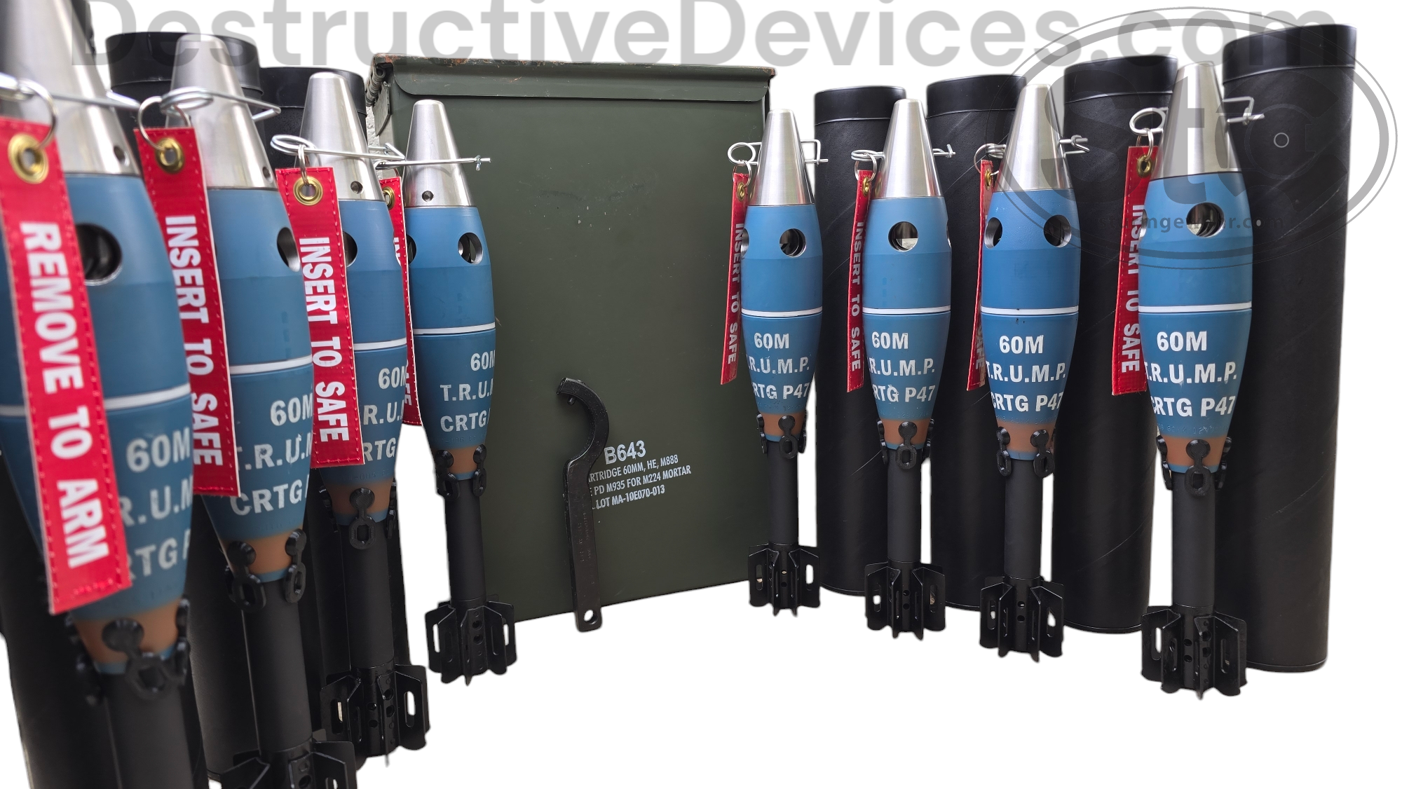 DestructiveDevices.com Posted December 27, 2024 Report Share Posted December 27, 2024 (edited) 60mm M57 mortar kit, as shown in the video below, is available for $8500+shipping. This includes the hard case, as well as everything in the case (no charges or expendables are included). I have the same kit available with U.S. parts (instead of the M57 Yugoslavian) for $9500+shipping. Everything is in excellent condition. These are some of the least expensive destructive devices that you can get, cheapest to shoot, as well as being extremely fun to shoot..........especially when using the TRUMP ammunition that is available. T.R.U.M.P. = Training Re-Usable Mortar Projectile 60mm M57 Yugo Mortar Kit: $8500 60mm M2 U.S. Mortar Kit: $9500 60mm P47 TRUMP round: $450 per round 60mm P47 TRUMP rounds: $2995 for 8 round can (~17% discount) and comes with transport/storage can and fuze wrench Provided you don't lose the rounds when firing, you can fire/recover/clean/re-fire the same round many dozens of times. We fired one round over 150 times and never broke or damaged the round (this will depend on what kind of soil the rounds are impacting.). They are extremely durable and well made (machined from hardened steel and stainless steel). The rounds use four different expendables per shot: one ignition charge, four dud plugs, one obturating ring, and one spotting charge. When the expendables are purchased in 100 shot quantities, the cost per firing is $8.80, which is substantially cheaper than most destructive devices.........and you can use the same round again and again and again, etc, etc. Here is the cost breakdown on the expendables: Ignition charges: $70 per box of 25 blanks Obturating rings: $200 per sleeve of 100 rings (not required for firing, but does greatly increase accuracy, as well as provide a 100% increase in range) Dud-plugs: $100 for a quantity of 400 plugs (4 plugs are used per shot, and must be used if a spotting charge is used in the fuze) Spotting charge: $79 per box of 25 blanks Using our mortars and components, you should expect the following performance: 60° barrel elevation without obturating rings: 123 yards 60° barrel elevation with obturating rings: 242 yards 45° barrel elevation with obturating rings: 320 yards As is the case with all mortars, you can greatly increase/decrease the mortars range by elevating/depressing the barrel assembly using the bipod The TRUMP ammunition is only available to qualified buyers (you must have an ATF approved Form 1, Form 2, or Form 4). The TRUMP rounds are ammunition for a destructive device, but the rounds are NOT destructive devices in-and-of-themselves. They do NOT require a $200 registration/tax stamp per round (like the one-time registration of the mortar launcher does). After purchase of the mortar kit, the cup (which is the serialized part) gets shipped to your FFL as a Title 1 firearm. The kit gets shipped directly to you, if you wish, or it can be shipped to your dealer as well. Using the information off the cup, and other info provided by me, you fill out an ATF Form 1 and submit to ATF, along with your $200 tax payment for making a destructive device. After ATF approves the Form 1, you send a copy of the approved Form 1 to me, and the barrel is shipped directly to you. The receiver screws onto the barrel in about 20 seconds, and now you have your ATF approved, live-fire, destructive device mortar. UPS Ground insured shipping on the mortar kit runs around $200. Shipping on a single P47 TRUMP round runs $20. Shipping on a can of eight P47 TRUMP rounds runs $75. We accept Visa, MasterCard, and Discover, with no credit card fees charged. Here is a video of the mortar kit, as well as the 60mm TRUMP rounds............... Edited December 27, 2024 by DestructiveDevices.com photos added 3 Quote Link to comment Share on other sites More sharing options...