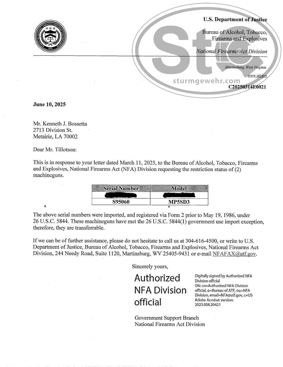 Kenneth Bossetta Posted June 19 Report Share Posted June 19 Fully Transferable MP5SD3 HK Factory Gun This gun has been owned since new by a very active major metropolitan SWAT team. It went from them to us. It’s killed more people than cancer and more dogs than PETA. It’s been well used but very well maintained and was issued until the day we picked it up. We opted not to recondition the gun as the patina tells a story and they are only original once. I’m not going to go over the factory stats because if you are in the market for this gun you know exactly what it is. The serial on the suppressor and gun match (obviously there is an S prefix on the gun). The ATF letter certifying this as a “flip” gun that went from being considered a pre-sample to fully transferable is also attached. For those of you who are not familiar with this, because these guns went straight from a bonded warehouse to a law enforcement agency prior to May 19, 1986, they are considered fully transferable. This gun is ready to transfer to your dealer on an efile F3 upon receipt and clearance of wire transfer (no ACH accepted). We will cover shipping cost anywhere in CONUS. The price is $100k. We are new to Sturm, but not the NFA market. Industry and customer references available upon request. Gun is available for inspection by appointment at our office. Live fire demo is also available by appointment. Our office number is 504-556-2000. The merely curious can call that. The serious buyers with cash in hand can call or text my cell at 504-717-3377. Link to comment Share on other sites More sharing options...