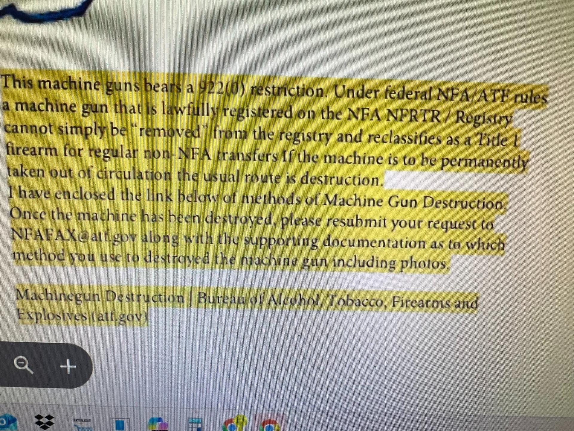 Greasegunner Posted November 12 Report Share Posted November 12 (edited) I have an interesting dilemma. I contacted DTV arms to do a conversion to full auto on my LWRC ar15 type pistol. They quoted me a price and said file Form 2 and send it with the firearm. I did that and when i got ready to send it, DTV said they dont do private work only government work now. . I contacted ATF with a e mail letter asking to remove it from the registry asthe firearm is in exactly the same state as when it left LWRC.I offered pictures and even have the gun inspected. No third hole, no full auto parts , nothing done. They answered me and said no, their response is attached below. the response is in tiny print and in order to read it you may have to magnify it. Anyone have any ideas? I believe that in this case the NFA branch is incorrect Edited November 12 by Greasegunner corrrection Quote Link to comment Share on other sites More sharing options...