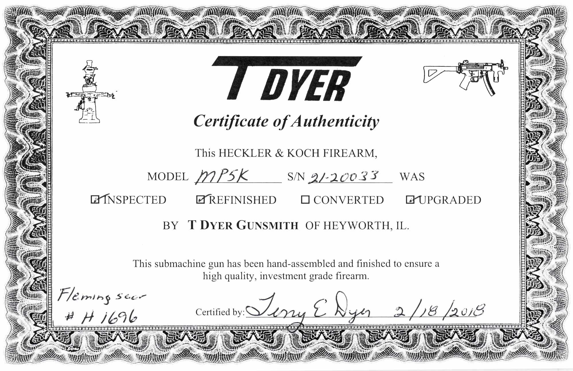 Ruben Mendiola Posted February 23, 2018 Report Share Posted February 23, 2018 H1696 & 2120033 HK MP5K-PDW, SBR, HK Qualified Machine Gun Auto Sear Installed in an SEF Trigger Pack in an MP5K-PDW Upgraded and Registered as an SBR by Mr. Terry Dyer with a Threaded Barrel with Thread Protector Gun is in Excellent Condition SEF Trigger Group, Barrel 3-Lug Adapter, Stamped MP5K, Original Magazine and Magazine Paddle Release. Like everything we sell, In Stock and Ready to eForm to your Dealer and available for your inspection in our office in Miami, FL. SOLD This gun has been recently serviced by Terry Dyer using our standard work order of “Make it Right”. What this means to you, is that once you receive your gun, you will be able to go out and enjoy it to its fullest (or stick it in the safe, knowing it is ready to go), because no expense has been spared in making sure it runs to its full potential. The checklist that each gun received includes the following • Complete visual inspection • Initial test firing for function and safety • Re-engraving of model when applicable • As necessary, strip the gun to bare metal, parkerize the base metal to act as a primer to promote better paint adhesion, and finally apply a special 3 part paint to bring the gun back to better than factory appearance • Verify headspace, timing, check bolt, extractor, etc. • Modify for a magazine paddle release when needed • Install the proper trigger housing • Add a 3-lug adapter or replace the barrel as needed • Final test firing and cleaning There is a long waiting list for any good HK smith to properly inspect and upgrade a HK product – we have taken that worry and wait out of the equation so we can offer the finest HKs on the market. As with all DealerNFA, Inc. guns, this items is owned by us, and is in stock at our Miami office, where it is available for inspection or eForm transfer to a dealer in your state. HK – In a world of compromise, DealerNFA doesn't. As with all DealerNFA, Inc. guns, this item is owned by us, and in stock at our Miami office, where it is available for inspection or eForm transfer to a dealer in your state. Dealernfa, Inc Ruben Mendiola President For the quickest response, please contact us through our toll free number 7 days a week, from 8:00 AM to 9:00 PM EST, or by email: ruben@dealernfa.com 305-271-3436 866-NFA-WANT (866-632-9268) Toll Free 866-415-7066 Toll Free Fax 305- 718 -4976 Fax Please visit our website for more detailed images that can be magnified at: | www.dealernfa.com | Facebook | Instagram | We are dealers and not Brokers. All firearms are in stock under our control and owned by DealerNFA, Inc With over 30 years in the Class III business, dealing in high quality legal firearms is not a hobby, but a profession - you will receive well deserved fast professional service. We are always looking for and paying top dollar for high quality legally registered machine gun, please either call me our my Toll Free line, email or fax. DealerNFA, Inc. pays the ATF transfer tax and payment is sent overnight. Florida residents are subject to Florida Sales tax. Link to comment Share on other sites More sharing options...